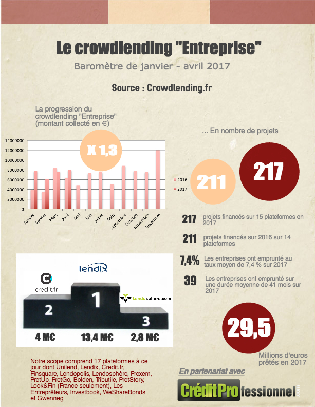 En avril 2017 les plateformes ont permis de prêter 8 040 131 € à 56 projets soit un montant moyen de 143 574 €. Les prêts ont été réalisés sur 45 mois en moyenne à un taux moyen de 7,33 %. On constate une croissance de 26 % des financements par rapport à avril 2016.